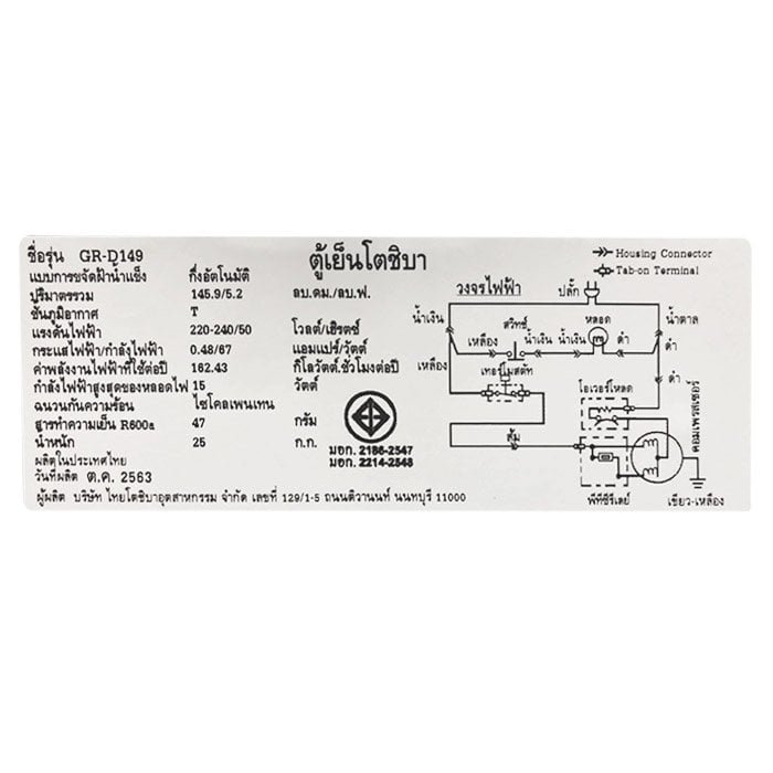 – ตู้เย็น โตชิบา 1 ประตู 5.2 คิว รุ่น GR-D149 มีขนาด (กว้างxสูงxลึก) 552x984x553 มม. น้ำหนัก 27 กก.