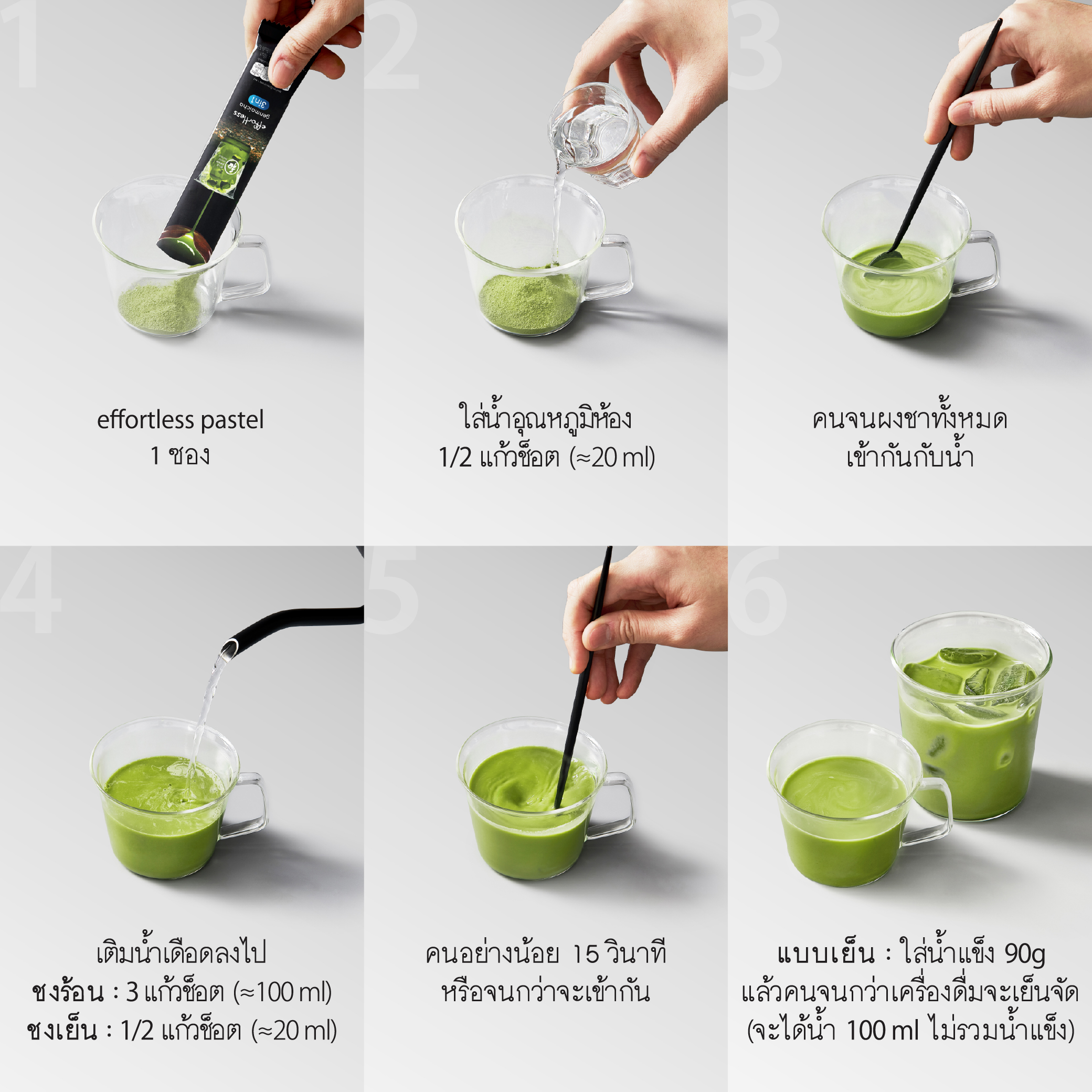Iced Pastel matcha : ชงด้วยน้ำร้อนแล้วเติมน้ำแข็ง